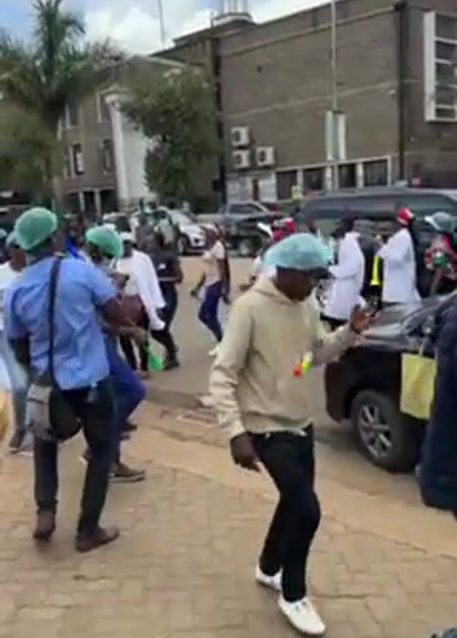 crowd of people dancing on a paved street. Many of them are wearing surgical caps and some are wearing lab coats, suggesting they may be healthcare workers. Some are holding and blowing on vuvuzelas. There are buildings in the background. People appear to be enjoying themselves and celebrating. Cars are parked near the edge of the street.