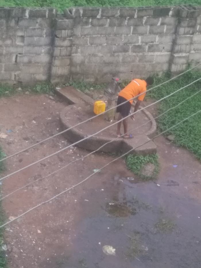 The image depicts an outdoor scene in Ihiagwa, Nigeria, featuring a single individual at a communal water source
