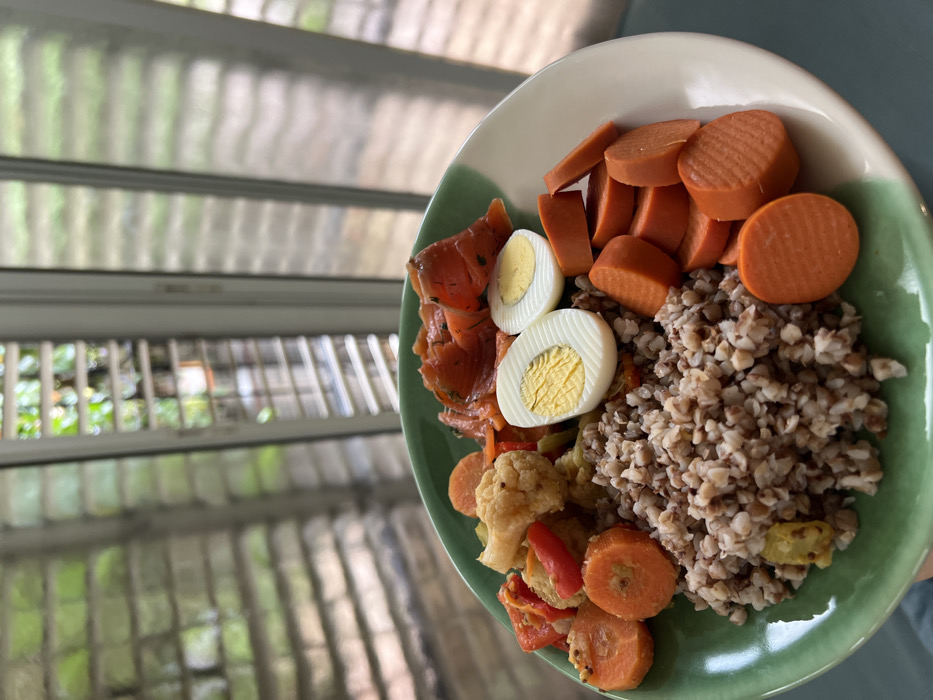 A still photograph depicts a close-up, overhead view of a meal served on a round ceramic plate, situated indoors in Givatayim, Israel. The plate features a two-tone design with a green interior rim and a white exterior. The meal consists of a central mound of cooked buckwheat (kasha), surrounded by various components. To the top-right are slices of smoked salmon, lightly seasoned with what appears to be dill. Adjacent to the salmon are two halved hard-boiled eggs, exposing their yellow yolks. Along the bottom and right edges of the plate are numerous circular slices of cooked carrots. To the left, a portion of mixed cooked vegetables is visible, including distinct florets of cauliflower, pieces of red bell pepper, and possibly green olives. The background, rendered out of focus, reveals an interior view looking outwards through a window or glass door. Vertical white frames define the window structure. Beyond the glass, an exterior environment is discernible under daylight. To the left, a portion of an light-colored brick wall is visible. To the right and center, green foliage from outdoor plants or trees is present, partially obscured by horizontal slats, consistent with exterior window shutters or blinds. No individuals are visible in the image.