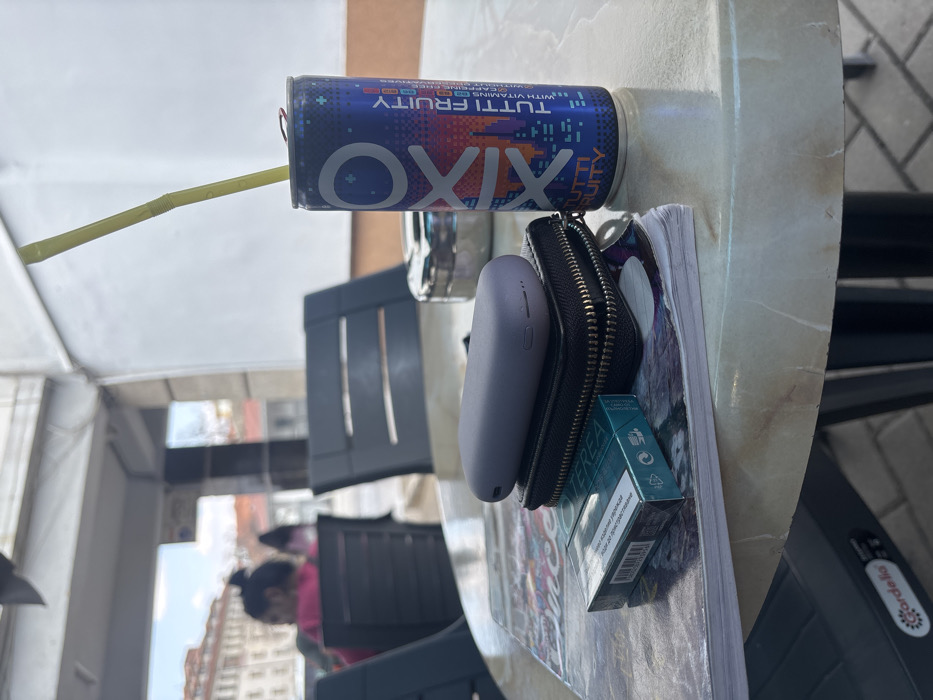 The scene depicts an outdoor cafe table in an urban area of Plovdiv, Bulgaria. On a round, light-colored marble-patterned table, a stack of magazines or books is visible. On top, a teal-colored cigarette pack with Cyrillic text is placed next to a black zippered wallet, which is topped by a lavender-colored oval electronic device. To the right, a blue "XIXO Tutti Fruity" energy drink can, with a yellow straw inserted, stands beside a small metallic ashtray. In the midground, dark-colored outdoor cafe chairs are present; one is occupied by a person with dark hair in a pink top, facing away from the camera. Another blurred figure is visible further back. The background features multi-story urban buildings and a bright sky. The pavement consists of light-colored paving stones, and a white structural frame or awning partially covers the outdoor seating area. No direct actions or interactions are immediately evident in the foreground.