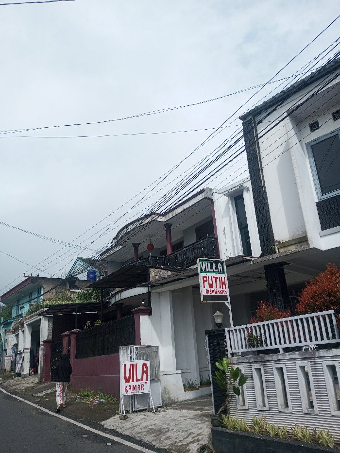A street view showcases houses and villas under a cloudy sky. Power lines crisscross above. A woman walks along the road. Signs advertise "Villa Putih Disewakan" (White Villa for Rent) and "Vila Kamar" (Villa Room). The houses feature white and colored facades, with some having balconies and fences. Vegetation is visible in front of one of the houses.