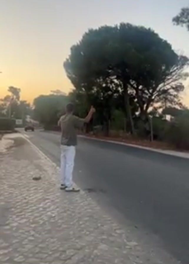 man standing on a cobblestone sidewalk, facing away from the camera towards a road. He has his arms outstretched to his sides, with his thumbs pointing upwards. The man is wearing a light green t-shirt and white pants. A red vehicle is driving down the road toward him. In the background, there are trees, and the sky is a pale orange color.