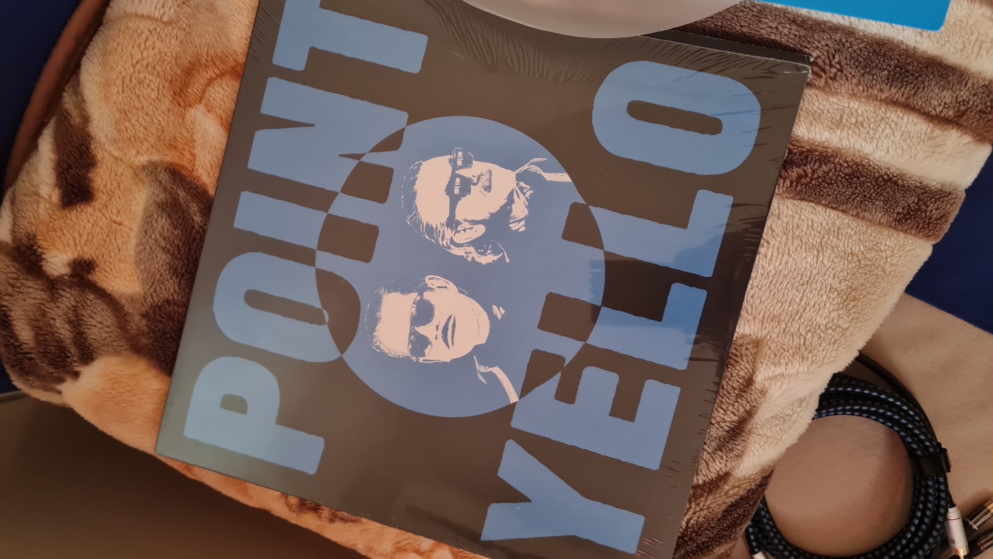 A shrink-wrapped rectangular album cover, oriented diagonally, rests on a beige and brown striped faux fur blanket. The album cover is black with prominent light blue text reading "POINT YELLO." Centered between the words is a light blue circular graphic depicting two stylized male busts, both with mustaches and wearing dark sunglasses. A subtle checkered pattern is overlaid on the light blue elements. To the lower left of the album, a coiled black audio cable with blue braided accents and silver-tipped connectors is visible. A portion of a white, possibly translucent, object is present on the right edge of the frame. A dark blue surface is partially visible beneath the blanket. The location is the Lachish Regional Council, Israel.