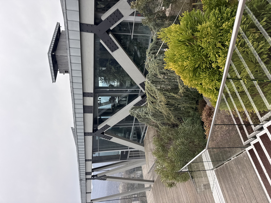 This image depicts an elevated outdoor terrace and a modern building located at SkyPark Sochi in the Adlersky District of Russia, under an overcast sky. The prominent structure is a multi-story building featuring extensive glass curtain walls supported by an external framework of heavy grey-painted steel beams forming a robust truss system. These beams are connected by black bolted plates. The building has a flat, seamed grey metal roof, with a smaller, elevated rectangular structure on top toward the right side. Through the large windows, interior spaces are visible, containing tables, chairs, and overhead lighting fixtures, suggesting a restaurant or cafe. Text, appearing as "Kaity" and "Kaitya," is visible on the glass panels of the building. In the foreground, a wooden deck extends across the scene. A set of wooden stairs with dark brown anti-slip strips leads downwards from the deck. A clear glass railing with a brushed metal top rail borders both the stairs and sections of the elevated terrace. Adjacent to the railing and building, landscaped garden beds feature a variety of evergreen plants: a bright green, dense shrub in the immediate foreground, a weeping conifer with bluish-green needles in the mid-ground, and other various green and some dried brown shrubs. The background reveals distant, undulating hills or mountains, appearing sparsely vegetated, under a uniformly grey sky. No people are visible in the scene.