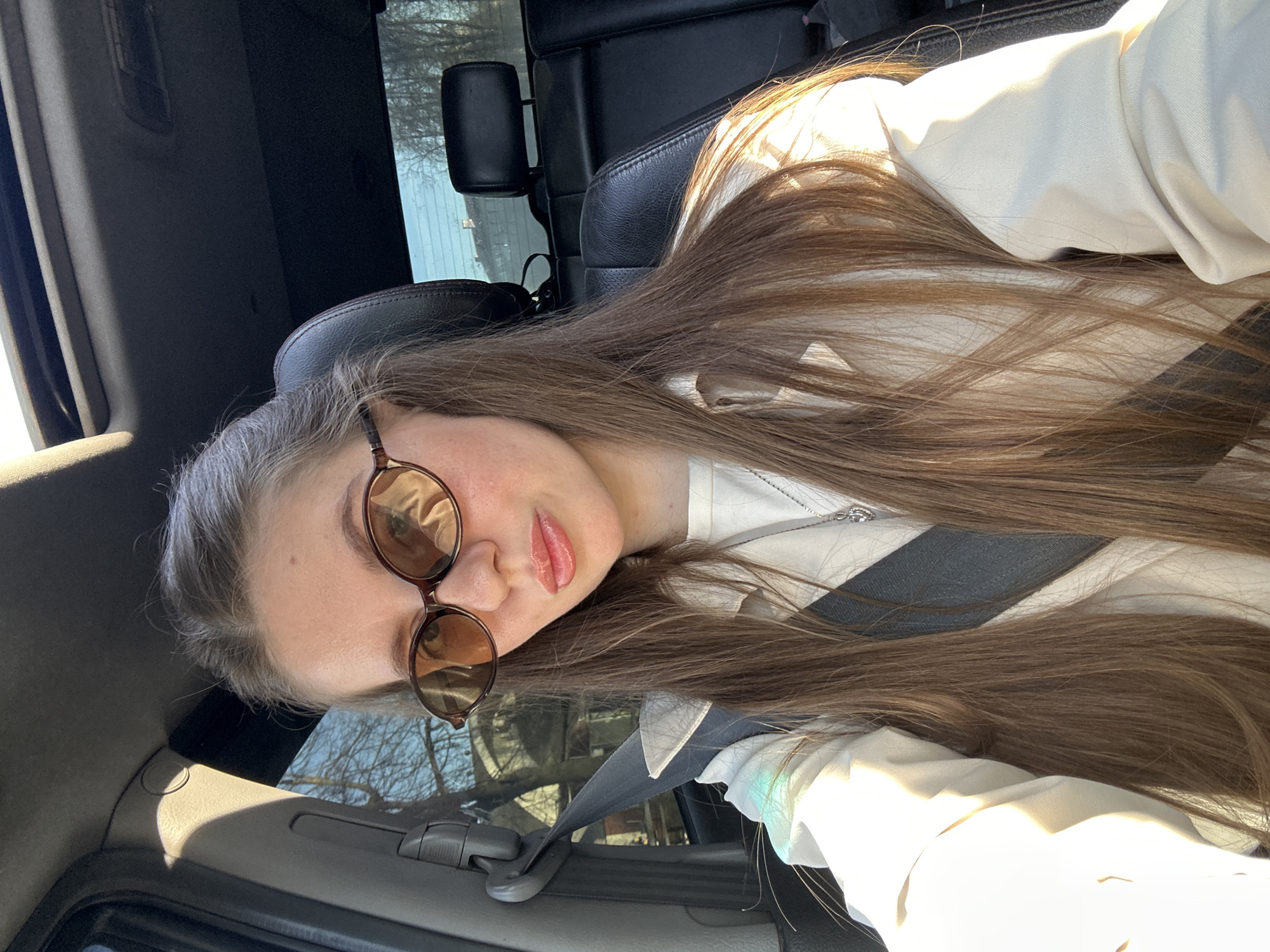 A young woman with long brown hair sits in the driver's seat of a car, wearing sunglasses and a seatbelt