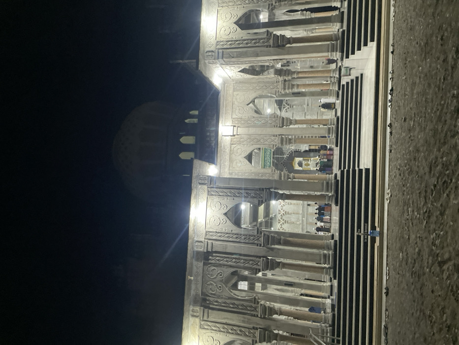 A night shot reveals a mosque-like structure, predominantly white with intricate arched designs. The building features a central dome and is illuminated, with figures appearing to pray inside. Stairs lead up to the structure, and there's a visible ground surface in the foreground. The background is largely black, emphasizing the brightly lit architecture.