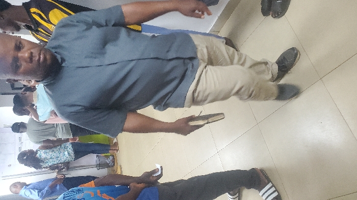 The scene depicts an indoor hallway or common area within a building, located at Unknown, Unknown. The floor is composed of light-colored square tiles, and the walls are plain white. In the mid-foreground, a dark-complexioned adult male is captured in motion, walking towards the viewer. He wears a dark grey short-sleeved button-up shirt, light khaki trousers, and dark shoes. His right hand holds a dark, rectangular object, consistent with a book or tablet, vertically by his side. To the immediate left, a partial view of another dark-complexioned adult male shows him wearing a blue t-shirt with orange detailing and dark trousers; a white and black striped slide sandal is visible on his left foot. He holds a small white piece of paper in his left hand. In the background, several individuals are present. On the far left, a dark-complexioned adult male in a light blue long-sleeved shirt and dark trousers stands facing right. Next to him, a dark-complexioned adult female with dark, possibly dreadlocked, hair is standing barefoot, clad in a light floral-patterned top and blue jeans, also facing right. A dark-complexioned adult male is seen from behind in the central background, wearing a green t-shirt and dark trousers. Other partially obscured individuals are visible towards the right background, including one wearing a black and yellow striped shirt and another in a light blue top. Affixed to the back wall are several papers or diagrams. A small, dark mesh waste bin containing crumpled paper is positioned on the floor near the back wall. The environment is illuminated by indoor artificial lighting.