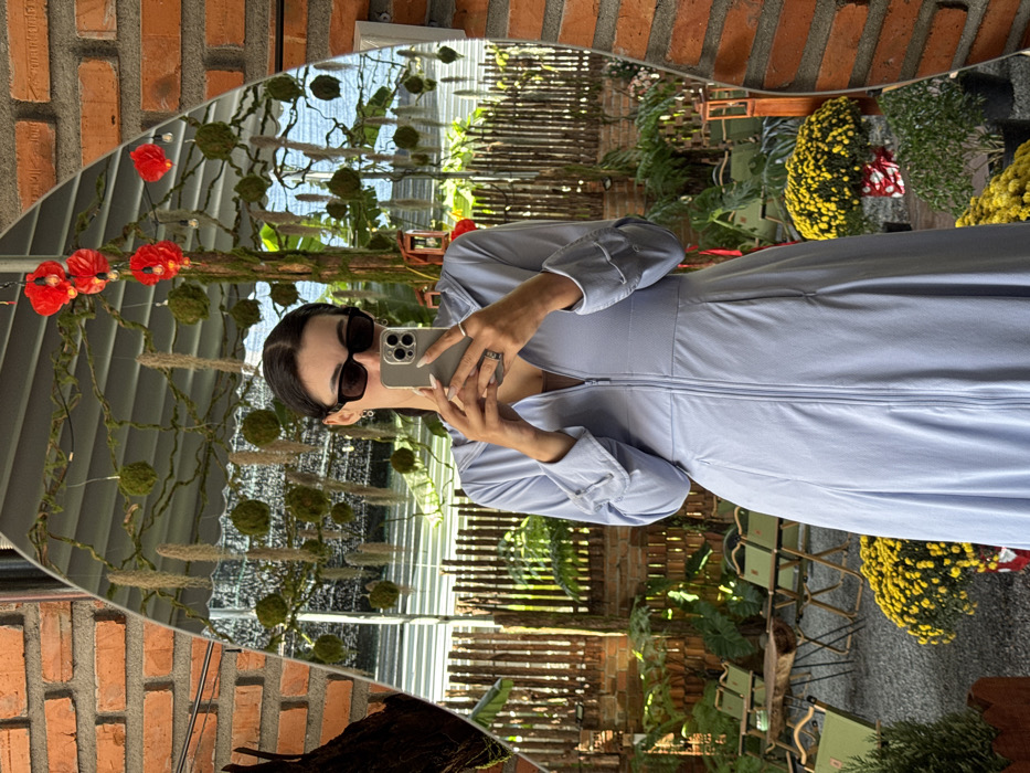 A woman in a light blue zippered dress and sunglasses takes a selfie in a curved mirror. The reflection showcases a lush outdoor space with hanging moss balls, red flowers, and a bamboo fence. Red brick walls frame the mirror on both sides. Seating and potted plants are also visible in the reflected scene.
