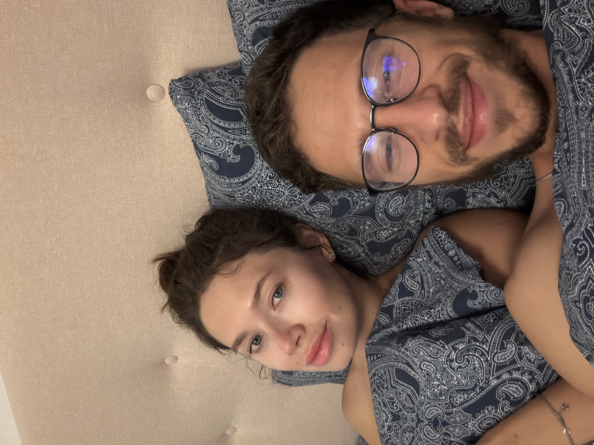 A man and a woman are lying next to each other in a bed. The man is on the top of the frame, wearing glasses, with a mustache and a beard. The woman is on the left bottom frame of the image. They are covered with a navy-blue paisley patterned blanket. The bed appears to have a light brown headboard. The image was taken inside, with artificial lighting. There is no visual evidence that this image was taken in Livadia Larnakas, Cyprus.