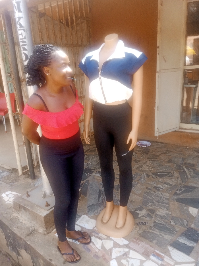 The scene depicts an outdoor commercial setting in Television, Nigeria, under bright daylight. On the left, a dark-skinned adult female with dark, braided hair stands smiling, looking towards the right. She wears a red off-the-shoulder ruffled top, black form-fitting leggings, and dark flip-flops. A small, light-colored stick is visible protruding from the right side of her mouth. To her right stands a headless, armless, light-brown mannequin, wearing a short-sleeved, cropped top that is dark blue on the upper portion with white shoulders and a white lower half, featuring a prominent white zipper down the front. The mannequin also wears black form-fitting leggings, with the text "UNLIMITD" partially visible on the left thigh. It stands on a beige, rounded base. The ground is paved with an irregular mosaic pattern of dark and light-colored tiles. The woman stands on a raised concrete step with metal fixtures. In the background, to the left, a metal security gate or grate is partially visible, along with a red chair. To the right of the mannequin, a light-colored door or window frame is visible against a reddish-brown wall.