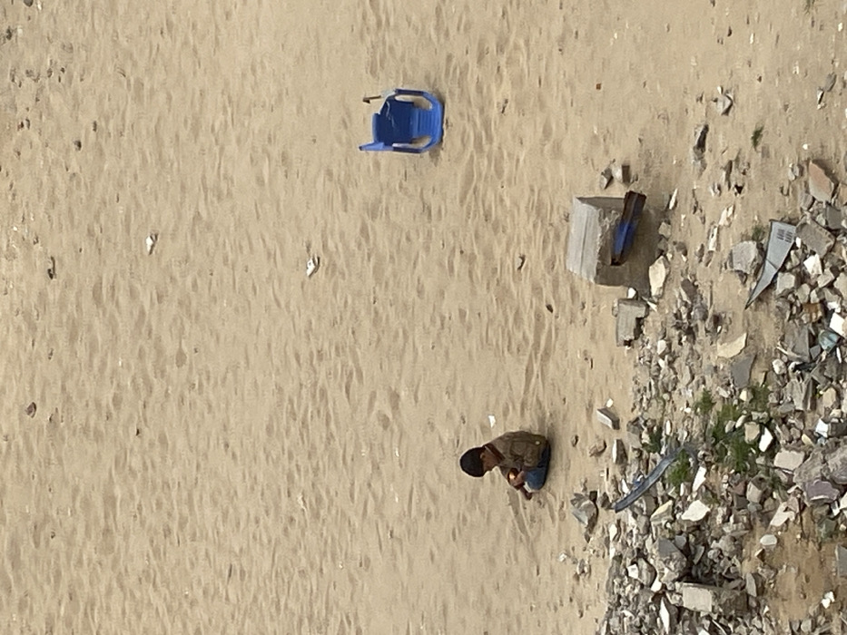 The image depicts an open, sandy area in the city of Khan Yunis, Palestinian Territory. The ground is predominantly light brown sand, showing subtle undulations and scattered small pieces of detritus. In the lower foreground, a substantial accumulation of debris is present, comprising fractured concrete blocks, smaller grey and white construction fragments, pieces of twisted metal sheeting, and sparse green vegetation. A single young child is seated cross-legged on the sand in the mid-ground, positioned slightly to the left of the frame's vertical center. The child wears a brown long-sleeved top and blue trousers. Their head is bowed, and their hands are held together near the ground, appearing to manipulate a small, indistinct object. To the right, further into the mid-ground, a broken blue plastic chair or seat lies on its side on the sand. Another blue object, possibly a bent piece of plastic or metal, is partially embedded within a cuboid concrete block located in the foreground debris, to the right of the child.