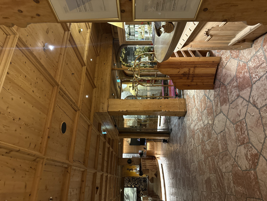 A vertically oriented shot showcases a hallway with wooden paneling on the left and patterned tile flooring on the right. A wooden reception desk sits near the entrance, with a golden luggage cart nearby. The hallway stretches into the distance, where additional wooden structures and decorative elements can be seen. The lighting is warm, enhancing the wooden textures and creating a cozy atmosphere. Two framed signs hang from the top of the image.