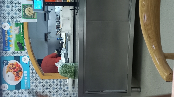 A reflective window showing a person in a red shirt is partially visible. A table with blue and white patterned covering displays advertisements for food. A stainless-steel cabinet stands beside a wooden chair. A bag of greens is partially visible next to the cabinet. Various items appear in the window's reflection, including a sink.