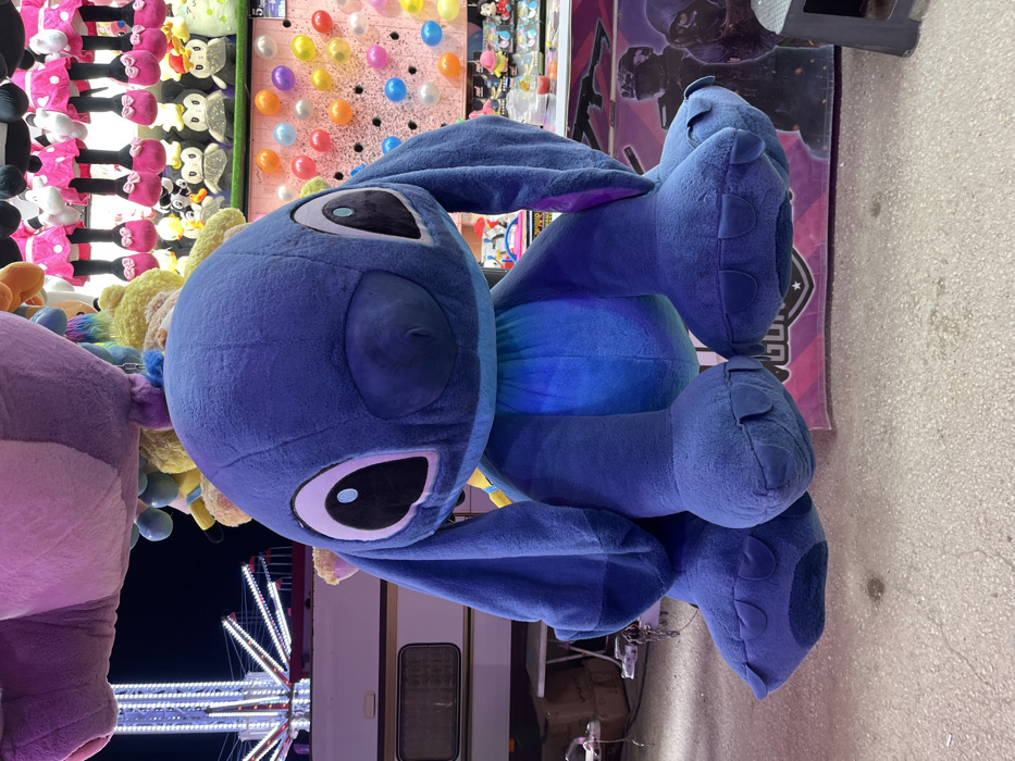 The image depicts a large, blue plush toy resembling the character Stitch, suspended prominently in the foreground