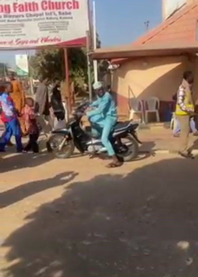man wearing a light blue suit on a motorcycle, near a crowd of people and a sign for Living Faith Church. The man on the motorcycle dances and gestures while sitting on the bike. A security guard in a yellow vest walks nearby. The environment appears to be outdoors, on a sunny day, with a building in the background. The people are dressed in a variety of clothing.