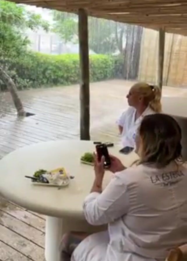 Two individuals are under a partially covered area with a bamboo ceiling, likely a patio or outdoor seating space, during a heavy rainstorm. Both are wearing white lab coats. One individual, with long hair and tattoos on their arm, is holding a smartphone in a vertical orientation and appears to be taking a photo or video of the other person, who is looking at the camera and smiling. There is a white, round table between them with what seems to be unfinished food and items like napkins and containers. The backdrop is a lush green area, visible through the downpour of rain. The ground outside is flooded with water. The words "LA ESTERNA" are embroidered on the back of the person taking the picture's lab coat.