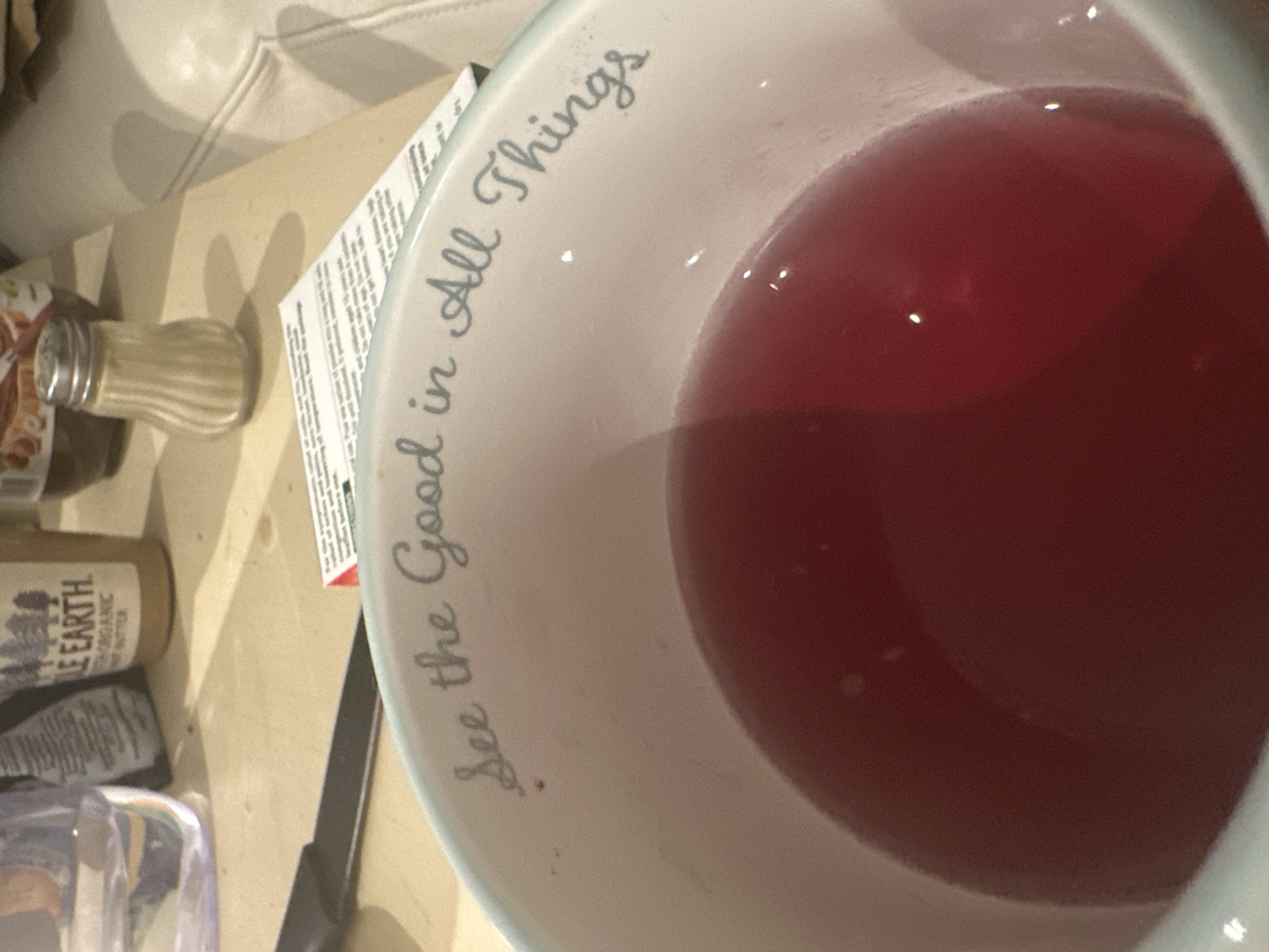 A close-up, angled shot of a white mug filled with a red liquid. The mug has the text "See the Good in All Things" printed on its side in gray lettering. The mug is situated on a light-colored surface alongside several other items. To the left of the mug, there's a jar with a ridged pattern and a silver lid. Below that jar, a brown bottle labeled "SOLE EARTH ORGANIC BUTTER" is visible. Further to the lower left, parts of transparent objects and packaging are present. A black knife lies near the mug, closer to the foreground. A partially obscured piece of paper with printed text is visible near the mug's rim. A cream-colored upholstered surface is visible in the upper left corner of the image. No people are visible in the frame. The location is unidentifiable.