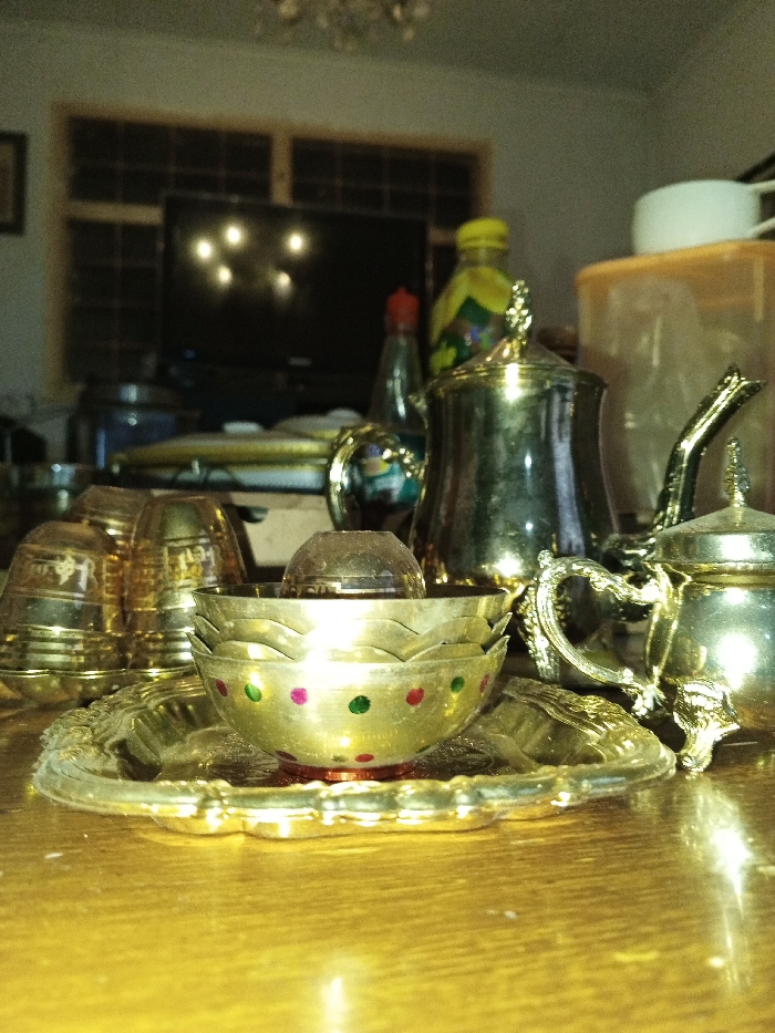 The image depicts an interior scene, likely a domestic setting, in Longmiang, Laos, focused on a collection of metalware on a polished wooden surface. In the immediate foreground, a round, ornate, gold-colored metal tray holds several items. A stack of small, decorative brass bowls is centered on the tray, with the topmost bowl featuring green and red polka dots on its exterior. To the left, several inverted brass cups are stacked. To the right, elements of an ornate, gold-colored metal teapot or creamer, including a handle and lid finial, are visible. Behind these items, a larger, tarnished silver-colored metal jug or teapot with a prominent lid and finial stands. Adjacent to it are a dark bottle with a red cap, a yellow-capped plastic bottle, and a light-brown rectangular plastic storage container with a white lid. In the background, a large, dark-screen television reflects several bright light sources. Behind the television, a window with a grid pattern is visible, framed by light-colored wood. A faint chandelier is discernible at the top center. No individuals are present in the scene.