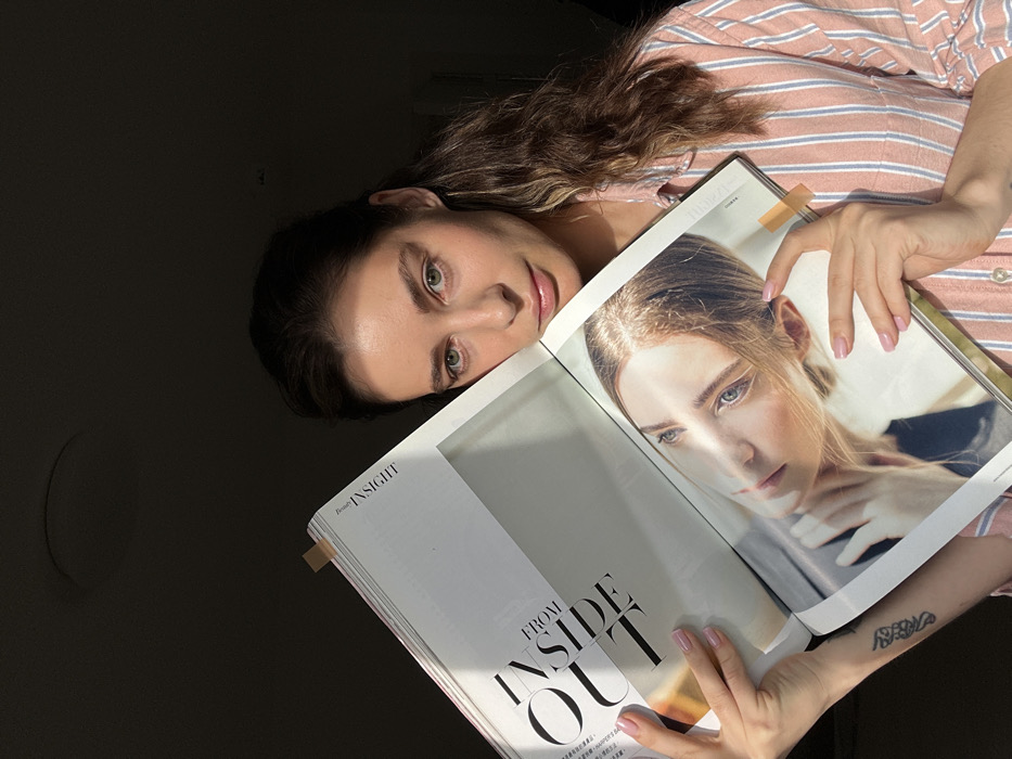 A female subject, an adult, is depicted indoors in the city of Unknown, Unknown. She possesses dark, wavy hair and prominent green eyes, gazing directly at the viewer. Her attire consists of a pink and white striped button-down shirt. A dark tattoo is visible on her left forearm. She holds an open magazine, angled slightly, with both hands; her nails are painted light pink. The magazine displays "FROM INSIDE OUT" in large text on its left page and a portrait of a woman with light hair and blue eyes on its right. The title "INSIGHT" is visible vertically near the top of the left page, and a small beige sticky tab marks the top edge. The subject's right cheek makes contact with the magazine's edge. Illumination is provided by a strong, directional light source, creating distinct shadows and rendering the background dark.