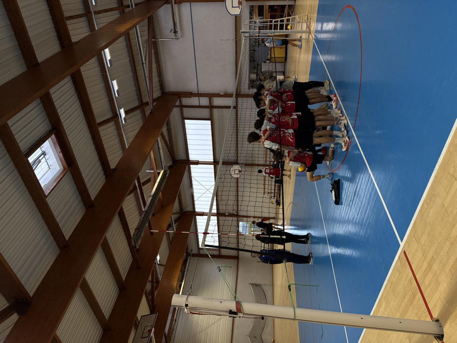 The image depicts an indoor sports gymnasium in Sennecey-le-Grand, France. A central volleyball court with a blue playing surface is visible, marked with white lines, while surrounding areas feature a wooden floor with red lines. On the near side of the volleyball net, approximately seven to eight young males, primarily wearing red and white jerseys with numbers and black shorts, are gathered in a huddle, with arms around each other's shoulders. One individual in this group is kneeling. A pair of black shoes rests on the blue court near the kneeling individual. To the left of the huddle, near the volleyball net's pole, an adult male in a blue long-sleeved shirt and dark pants stands, observing the group. Next to him, an adult female in dark clothing also stands. In the background, behind the net, multiple individuals are present. One young male in a red jersey is visible further back on the court, near a basketball hoop. Another individual in a light blue shirt stands near a white equipment ladder or rack on the far right. Additional figures are partially visible further in the background. The gymnasium features a high ceiling constructed with prominent wooden support beams and a corrugated metal roof. A square skylight is present in the ceiling, providing natural light. Fluorescent light fixtures are suspended from the ceiling beams. Large rectangular windows with multiple panes run along the upper sections of the walls, allowing additional natural light. Basketball hoops with backboards are mounted on the walls at both ends of the court. The volleyball net spans the width of the court, held by white poles secured into the floor.
