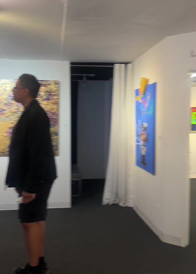 n art exhibit. The first scene shows a person in a plaid shirt and jeans standing with their hand to their face next to another person with their back to the camera. There is art on the wall behind them. The camera pans to the right to reveal a doorway that reads “Lazarus Gallery” leading into another room. The camera then shows three framed pieces of artwork hanging on a white wall. The video ends with the camera focusing on the painting of a volcano framed in black. Above the painting is text that reads, “TAG Artists Present Fire”.