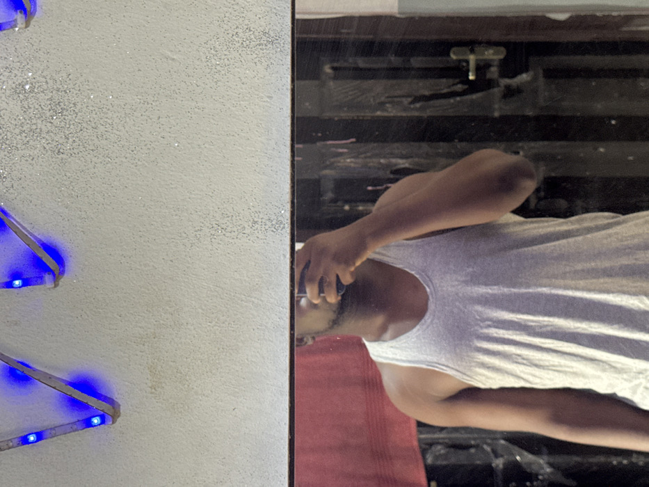 The image depicts a male individual taking a selfie in a mirror within an indoor setting. The specific location within the city of Asipa, Nigeria, cannot be determined from the visual evidence. In the upper portion of the frame, a light-colored, textured wall is visible, adorned with two sections of exposed circuit boards featuring bright blue LED lights. These lights cast a blue glow onto the wall, which also displays sparse glitter-like particles, particularly on the right side. The lower portion of the image is dominated by the reflection in a rectangular mirror. Reflected in the mirror, a male subject with dark skin is seen from the chest up, wearing a light grey tank top. He possesses visible musculature in his arms. His face is largely obscured by a dark-colored smartphone, held in his right hand, indicating he is capturing his reflection. A short beard is discernible on his chin and jawline. In the reflected background to the subject's left, a folded red cloth or towel hangs against a surface. To the subject's right, a dark, possibly wooden, door with a brass or gold-toned door handle/knob is reflected. The mirror surface exhibits some minor streaks and dust particles.