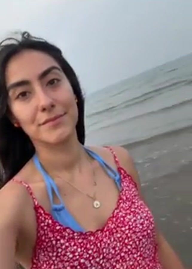 A young woman is recording a selfie video on a beach. She is wearing a red and white floral patterned dress over a blue bikini top. She has long dark hair that is blowing in the wind. She is wearing a necklace and a bracelet. The ocean is behind her, with waves visible. The sky is overcast. She smiles at the camera and runs her hand through her hair.