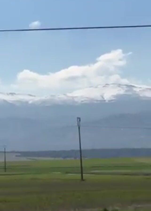 landscape with green fields, telephone poles, and mountains in the background. The mountains have snow on their peaks. The sky is blue with some clouds. The video appears to be taken from a moving vehicle, as the landscape shifts in the frame.