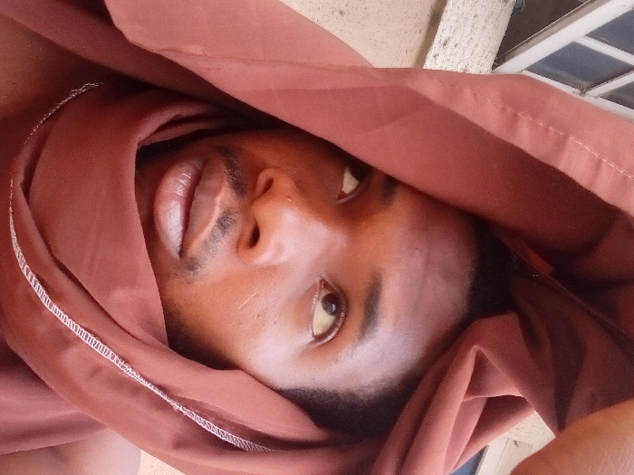 A person’s face is mostly covered by a reddish-brown fabric, possibly a scarf or shawl. The person's features are visible, including an eye, nose, and mouth. The fabric is draped around the person's head and neck. The background is blurry, showing a window with panes. The image's orientation is tilted. The person has dark hair and smooth skin. The overall impression is a casual, close-up shot of a person partially veiled in fabric.