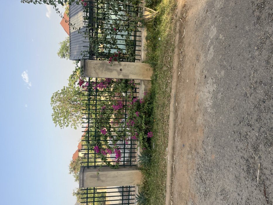 This image depicts an outdoor scene located in the city of Abuja, Nigeria. The foreground consists of a grey, partially unpaved road with visible gravel and dirt, bordered by a raised, light brown concrete curb. Immediately behind the curb is a strip of green grass mixed with exposed soil. A black metal bar fence spans the width of the frame, acting as a property boundary. This fence is anchored by three light brown concrete pillars; the central pillar contains a circular hole. Vibrant pink bougainvillea plants with numerous flowers are heavily intertwined through the metal bars of the fence, particularly on the left and center. Additional green foliage and several succulent plants are visible at the base of the fence on the left. In the background, beyond the fence and a scattering of green trees, several buildings with red-tiled roofs and one with a dark corrugated metal roof are discernible. The sky above is clear light blue with a few small white clouds. No individuals or specific actions are present in the scene.