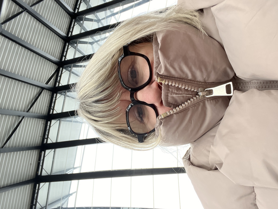 A close-up, eye-level photograph captures an adult female from the upper chest upward, centered in the frame. She has short, light blonde hair with bangs extending across her forehead. She wears black, rectangular-framed glasses, through which her eyes are visible. The bridge of her nose is also visible, but her mouth and chin are concealed by the collar of a pale taupe or light beige puffer-style jacket, which is zipped high to just below her nose. A silver-toned zipper pull is prominent in the lower center of the frame, with a single short, white fiber caught in the zipper teeth directly above it. The subject is looking directly towards the camera. The background consists of a modern architectural structure with a light-colored, ribbed ceiling supported by dark, possibly black, diagonal and vertical structural beams. Below the ceiling and beams, large glass panels are visible, revealing an overcast bright sky outside. The architectural style suggests an indoor public space, specifically consistent with a terminal building at Lyon-Saint Exupéry Airport in Colombier-Saugnieu, France.