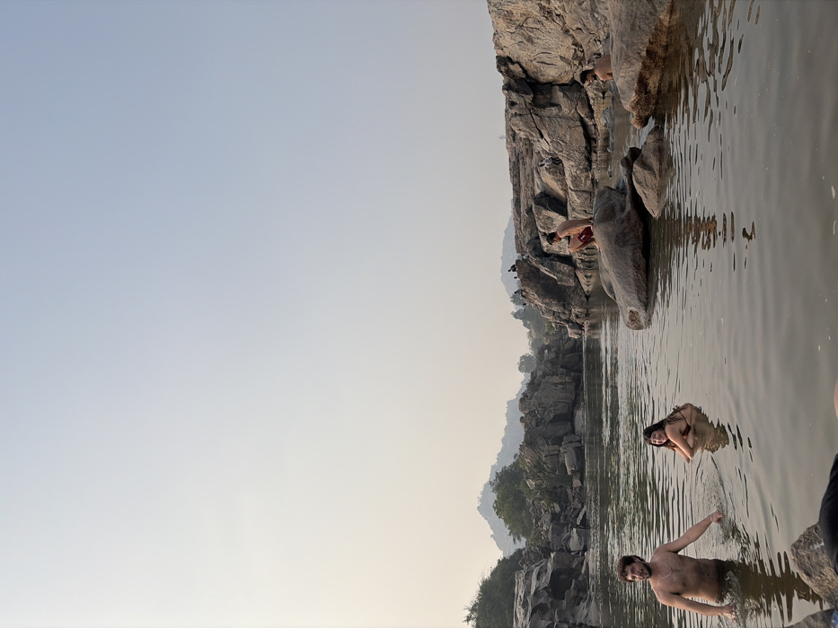 The image portrays a natural river environment in Hale Bandi Harlapura, India, under a hazy sky that transitions from a pale yellow-white near the horizon to a faint blue overhead. The scene focuses on a calm, brownish-green river bordered by extensive formations of large, grey, weathered rocks. Four individuals are present in the foreground and midground. In the left foreground, a shirtless man with dark hair and a beard stands waist-deep in the water, facing slightly right. To his immediate right, a woman with long dark hair is partially submerged in the water, wearing a dark-colored top, and facing left. In the midground, a shirtless man wearing red shorts crouches on a large, partially submerged rock, looking down towards the water. Further to the right, a fourth shirtless man with dark hair and a beard is seated on a rock near the water's edge, partially obscured. Several small, dark figures are visible atop the rock formations along the right bank. The left bank consists of dense rock formations, with distant green foliage and hills visible beneath the hazy sky.