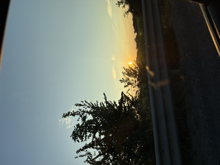 The image captures a landscape through a window, displaying a sunset scene. The sun is positioned near the horizon, its light partially obscured by trees. The sky transitions from blue to yellow near the horizon. A guardrail and part of a vehicle's window frame are visible, framing the scene. The right side shows a dark, possibly paved area.