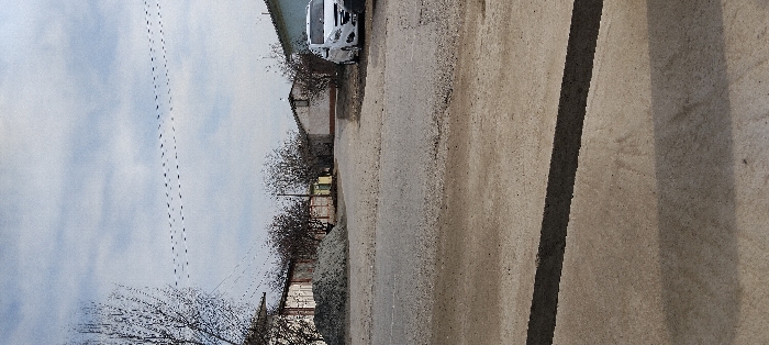An eye-level, angled shot captures a road scene. A light-colored vehicle sits parked on the left side of the frame. The road itself occupies much of the view, with patches of gravel visible along its edges. Buildings line the left side of the road, partially obscured by bare trees. The sky above is overcast, filled with light blue and gray clouds, marked with what appears to be contrails. A concrete structure with two lines or shadows sits in the right side of the image.