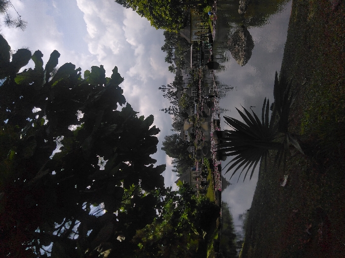 A tranquil pond reflects the sky and surrounding landscape. Trees and foliage line the banks, their silhouettes framing the water's edge. Buildings and structures stand in the background, partially obscured by the vegetation. A prominent palmetto-like plant is positioned near the water, its leaves casting shadows. The image evokes a sense of serenity and natural beauty.