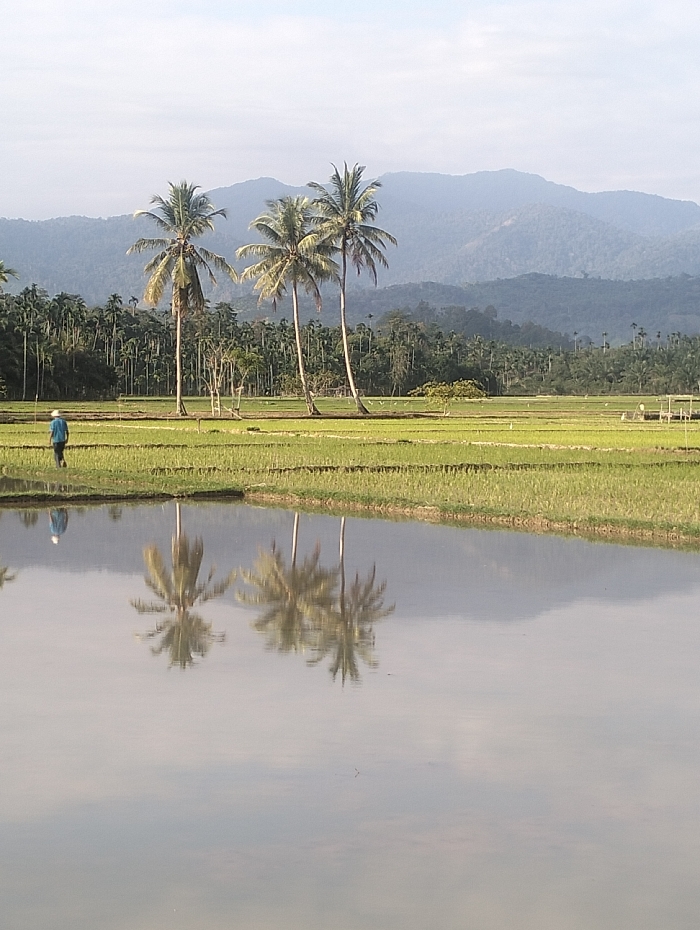 A tranquil scene displays a flooded rice paddy with the reflections of three slender palm trees. A lone figure in a blue shirt and hat walks along the edge of the paddy. Behind the trees, a dense forest stretches toward a backdrop of rolling, hazy mountains under a pale sky. The foreground emphasizes the reflective water and the vibrant green rice shoots.