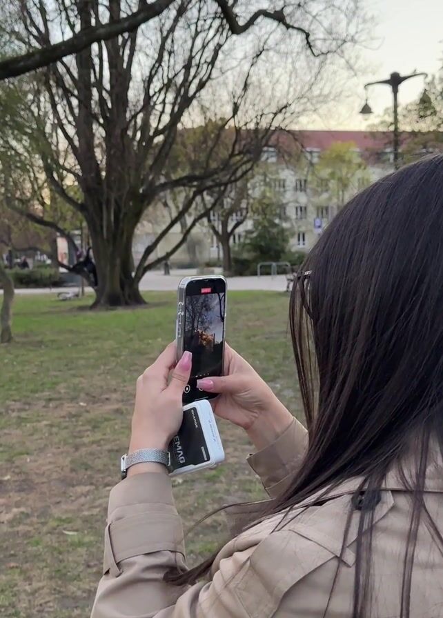 A woman with long, dark hair, wearing a tan trench coat and blue jeans, is taking a video with her phone in a park. The park has grassy areas and large trees. She is holding the phone in front of her, capturing the park scene. In the background, there are buildings and other trees. The sky is visible, suggesting it might be dusk. The phone has a clear case and a black, rectangular device attached to the back, bearing the name "EMAG." After taking the video, the woman lowers the phone, and the view shifts toward the trees in the park.