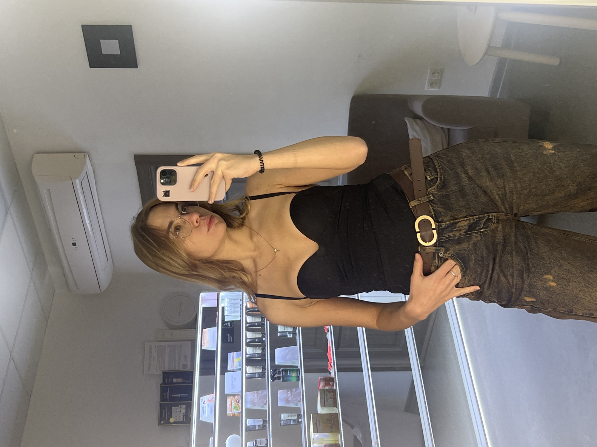 A female subject is depicted in a mirror selfie, standing and posing inside what appears to be a commercial establishment