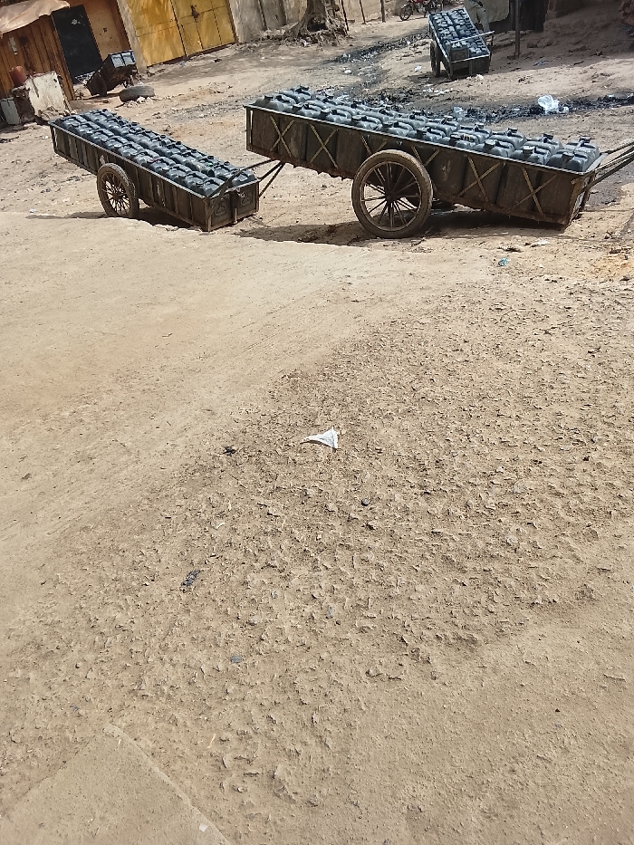 The scene is an unpaved outdoor area in Fagge D2, Nigeria, under daylight conditions. Two connected wooden, two-wheeled carts are stationary on dusty, sandy ground. The front cart, positioned to the right, is laden with approximately 45 dark, square plastic jerrycans, each with a handle, arranged in multiple rows. Its large spoked wooden wheel is visible. The trailing cart, positioned to the left, is similarly filled with approximately 35 dark plastic jerrycans and also features a spoked wooden wheel. A small, crumpled white plastic object rests on the ground in the mid-foreground. In the background, across a dirt path, several low-rise buildings with closed, metal or wooden doors (some yellow, some dark) are visible. Further in the background, a third, smaller wooden cart, also carrying dark jerrycans, is present, along with a portion of a motorcycle. No people are visible within the frame.