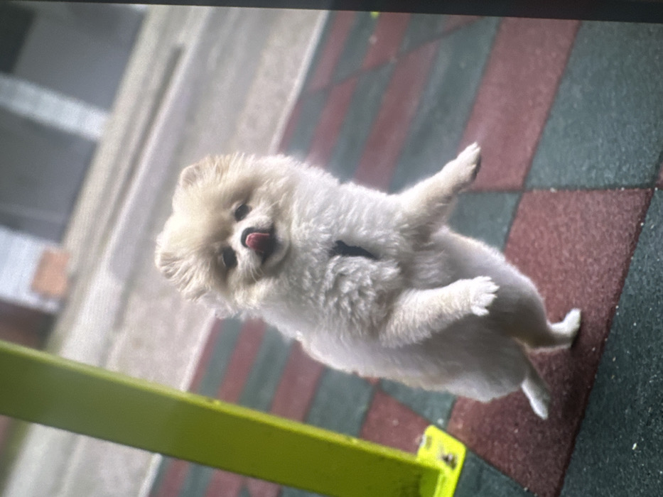 A small, cream-colored Pomeranian-type dog stands upright on its hind legs on a tiled rubber surface