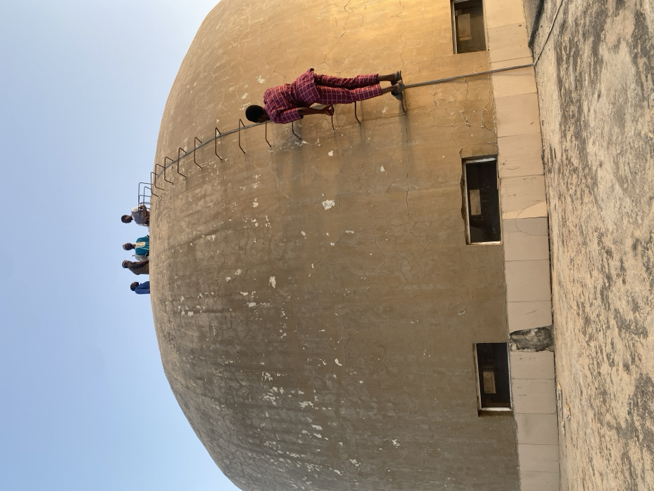 An outdoor scene in Barako, Nigeria, features a large, weathered, light-beige concrete dome structure under a clear, pale blue sky. A fixed metal ladder, comprising vertical rails and horizontal rungs, is attached to the dome's exterior, extending from the lower section towards its apex. One individual, dressed in a red and white patterned short-sleeved top and matching trousers, and wearing dark sandals, is actively ascending this ladder, positioned on its lower-mid section. Five other individuals, appearing to be adult males in various traditional garments including tunics and caps, are gathered at the dome's summit, appearing to sit or stand. The lower portion of the dome is encircled by a band of light-colored tiles, some exhibiting damage or misalignment, above which are several rectangular, unglazed openings. The foreground presents a flat, textured concrete ground surface. The lighting indicates clear ambient daylight, with warmer illumination evident on the right side of the dome.