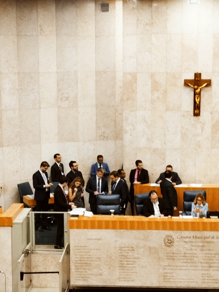 Inside a governmental chamber, several people in formal attire stand and sit behind a long, engraved wooden desk. A woman with blonde hair sits to the right. A crucifix hangs on the wall above them. The room has light-colored stone walls and the inscription "Camara Municipal de Sao Paulo" is visible on the desk.