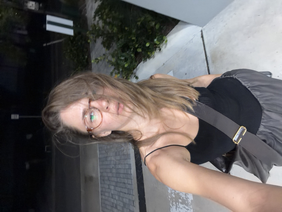 A woman with brown hair and round glasses poses close to the camera. She wears a black tank top and a gray skirt, with a dark leather purse hanging across her body. The photo is taken outside, with some greenery visible in the background and a street with some street signs. The lighting suggests it is dusk or night.
