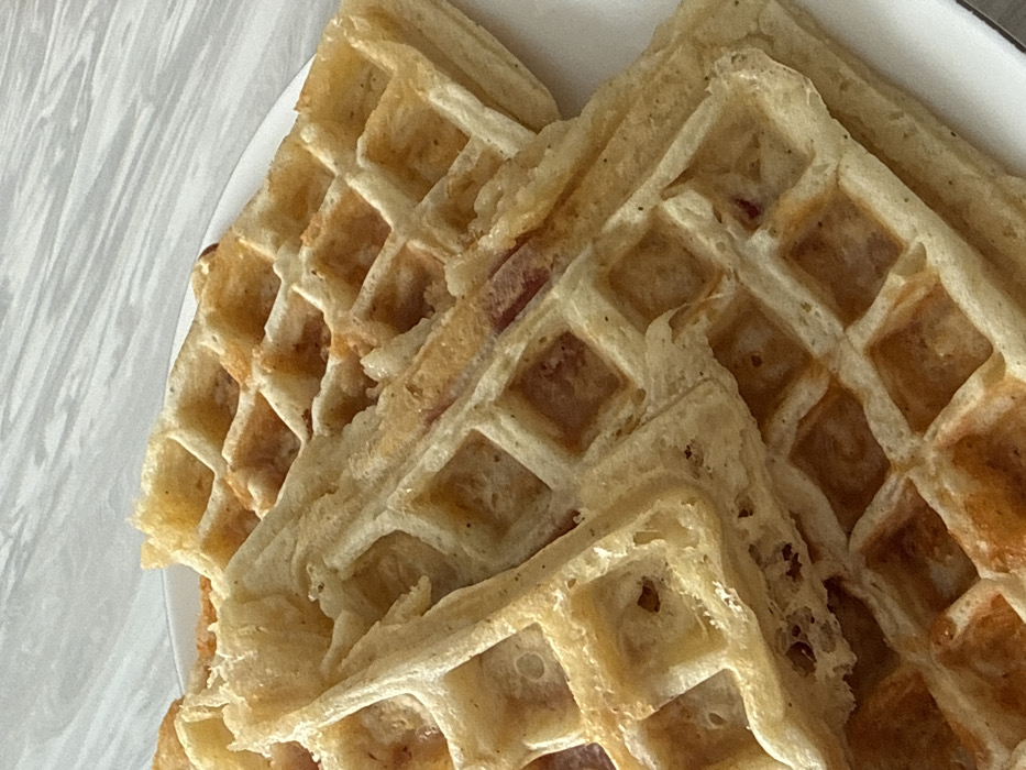 - "The image displays a close-up, slightly overhead view of multiple cooked waffles arranged on a white plate" by FM-R3Xq42, licensed under CC BY 4.0