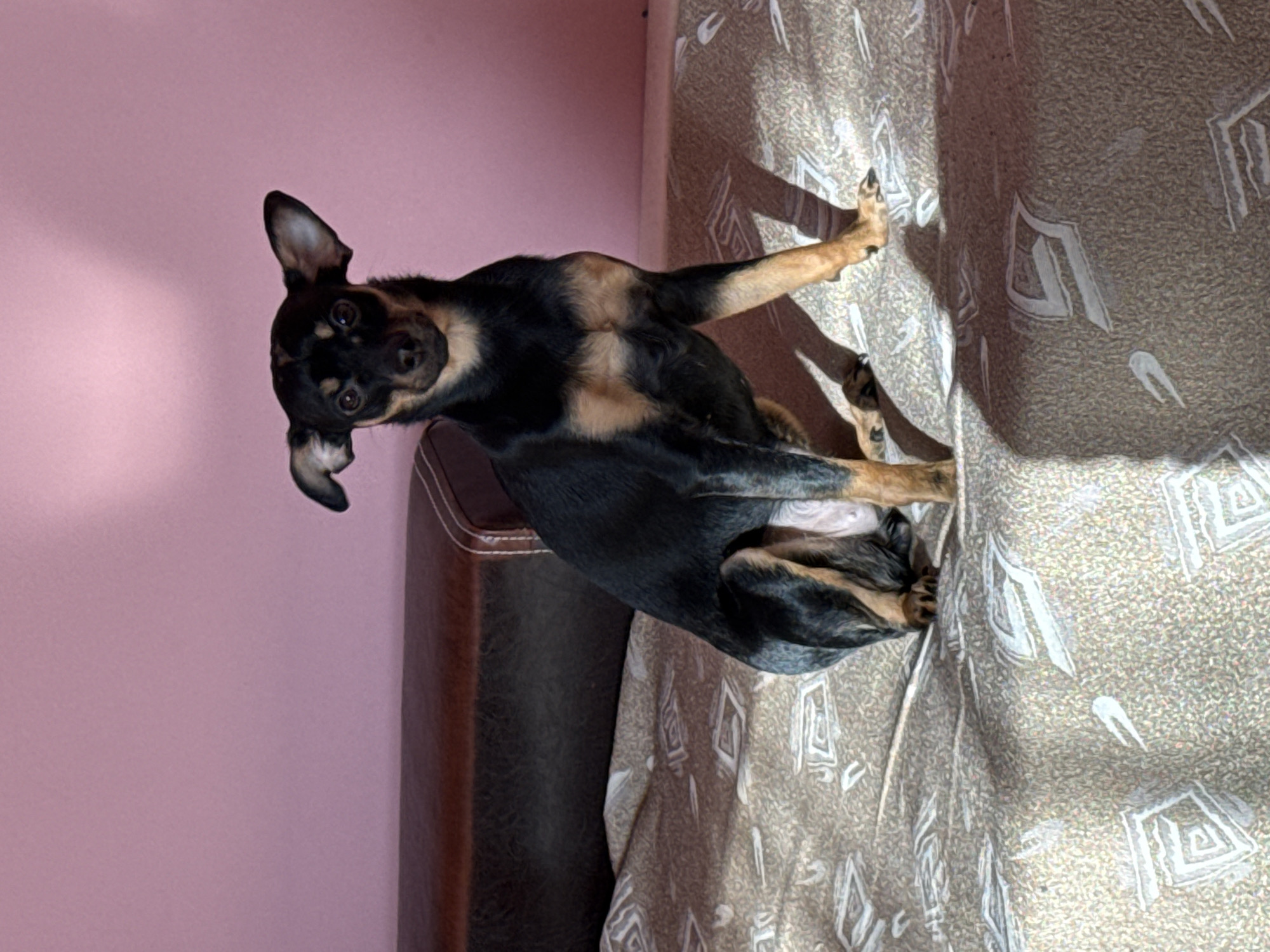 - "A small, black and tan dog, consistent with a Miniature Pinscher or similar breed, is seated upright on a bed or sofa in an indoor setting within Septemvri, Bulgaria" by FM-7iuEV2, licensed under CC BY 4.0