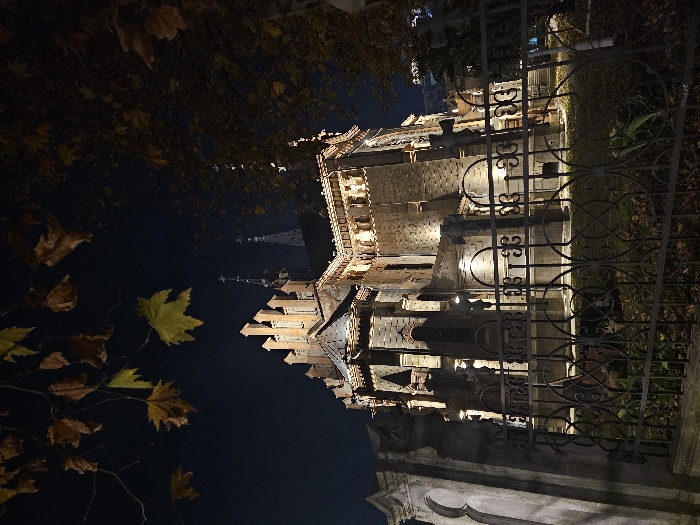 A dimly lit building with intricate stonework stands behind a dark, ornate iron fence. The structure features multiple spires and pointed gables, illuminated by warm light that highlights its architectural details. Leaves are visible in the foreground and above, suggesting autumn. The sky is dark, indicating it's nighttime.
