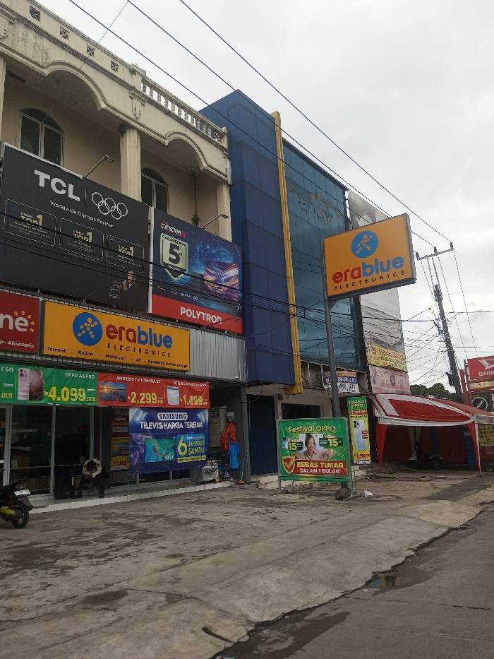 The image depicts an outdoor commercial street scene under an overcast sky. On the left, a multi-story building features a cream-colored facade with classical architectural elements, including columns, arched windows, and a balustrade on the upper level. Large billboards are affixed to its facade, displaying "TCL Worldwide Olympic Partner" and "CINEMA X POLYTRON." Below these, a prominent blue "erablue ELECTRONICS" sign advertises "Televisi, Kulkas, Mesin cuci, AC" (Indonesian for Television, Refrigerator, Washing machine, Air Conditioner). The adjacent building on the right presents a modern blue glass facade with a vertical yellow trim. A large yellow "erablue ELECTRONICS" sign, mounted on a pole, stands prominently in front of this building. On the ground level, the left building houses an electronics store, with window banners advertising "OPPO A96 PRO" for "Rp 4.099.000," "Android TV Toshiba 32"" for "2.299," and "SAMSUNG TELEVISI HARGA TERBAIK" (Samsung Best Price Television). A person in blue and red attire stands near the store's entrance. A yellow scooter is parked on the wet concrete sidewalk to the left, near a partially obscured individual who appears to be seated or bent over. To the right, a red and white striped tent structure is erected on the ground. A green A-frame sign for "Festival OPPO" is positioned on the sidewalk, advertising "BEBAS TUKAR DALAM 1 BULAN" (Indonesian for Free Exchange within 1 Month). Overhead, numerous black power lines crisscross the frame, connecting to utility poles visible on the far right, where a small "DAIHATSU" sign is also discernible. The street surface is paved concrete, showing patches of moisture. Based on the Indonesian language and currency (Rupiah) displayed on multiple signs, the depicted location is in Indonesia, not Ariyalai, Sri Lanka.
