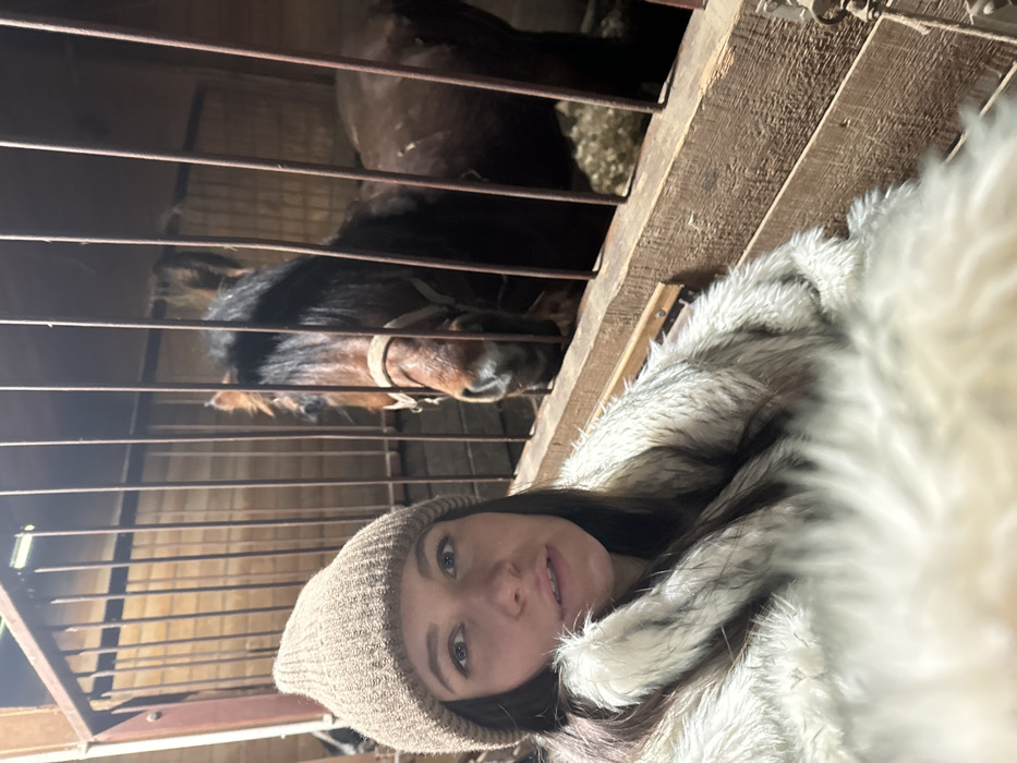 The image depicts an indoor scene within a stable located in Kalinovo, Russia. In the foreground, a female individual is captured in a selfie-style photograph. She wears a light brown knit beanie and a voluminous, light-colored fur or faux fur garment. Her long, dark hair is visible beneath the beanie. Behind a barrier of vertical metal bars, a brown horse with a dark mane and a light-colored halter is visible inside a stall. The stall's walls are constructed from wooden planks, and bedding material is present on the floor. Artificial lighting illuminates the upper portion of the scene. The female's gaze is directed towards the camera, while the horse's head is slightly lowered, facing generally forward.