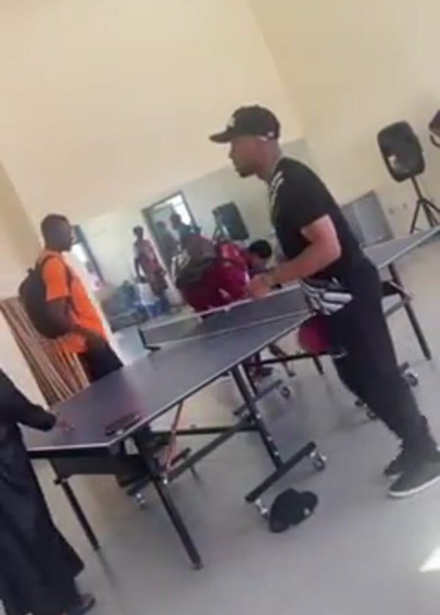 n indoor space where people are gathered around a ping pong table. The table is set up in the center of the room. Several individuals are standing near the table, including one wearing an orange shirt and another in a burgundy tracksuit. A man wearing a black shirt and a black baseball cap walks near the ping pong table. Other people are visible in the background, sitting or standing. A speaker on a stand is positioned near the table. The room has light-colored walls.
