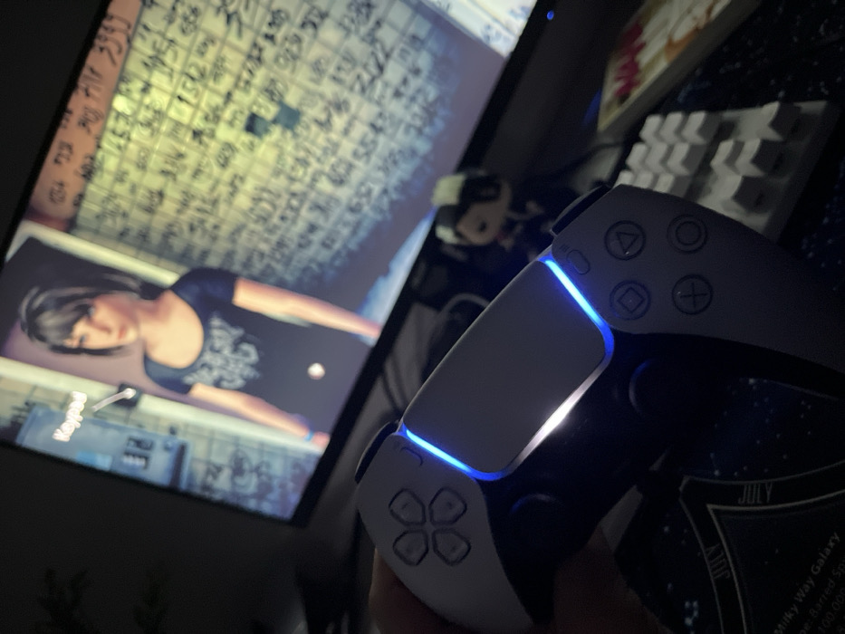 The image depicts an indoor, dimly lit environment, likely a personal room, where a person is engaged in video gaming